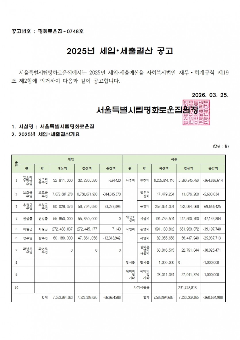 2025년 세입 세출 결산서 공고 페이지 정보 작성자 한동주 작성일 26-03-25 16:42 조회 12회 댓글 0건 첨부파일 파일 홈페이지 세입.세출견결산공고.pdf (58.6K) 0회 다운로드 DATE : 2026-03-25 16:42:12 본문 2025년 세입세출 결산서를 붙임과 같이 공고합니다. 이전글 다음글 목록 답변