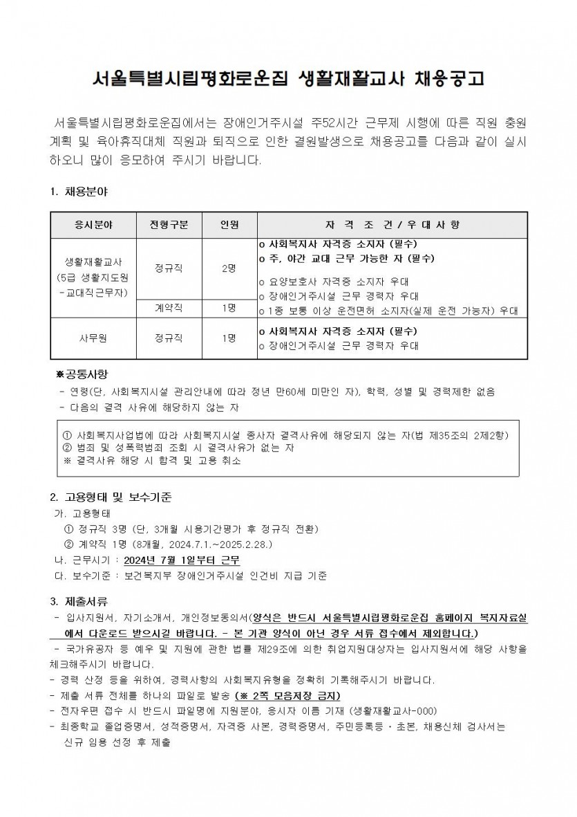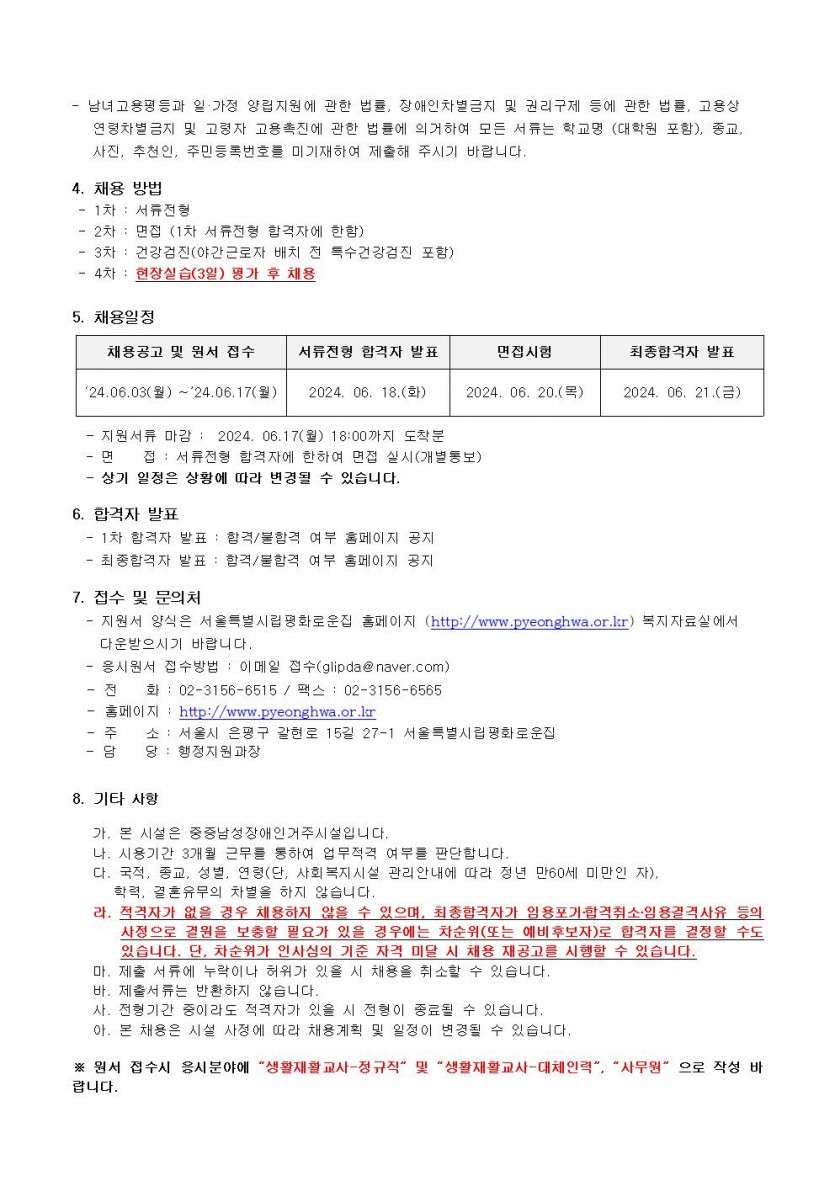 2024년 평화로운집 6차 직원채용 공고 페이지 정보 작성자 한동주 작성일 24-06-03 13:16 조회 18,881회 댓글 0건 첨부파일 파일 시립평화로운집 입사지원서이력서,자기소개서및개인정보동의서.hwp (22.5K) 188회 다운로드 DATE : 2024-06-03 13:16:55 파일 2024년-생활지도원사무원-6월.hwp (36.5K) 126회 다운로드 DATE : 2024-06-03 13:35:52 본문 2024년 평화로운집 6차 직원채용 공고를 다음과 같이 공지하오니 관심있는 분들의 많은 참여 부탁드립니다. 이전글 다음글 목록 답변