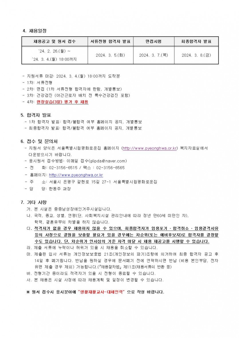 (긴급)서울특별시립평화로운집 생활재활교사 채용공고(연장) 페이지 정보 작성자 한동주 작성일 24-02-26 14:43 조회 20,165회 댓글 0건 첨부파일 파일 시립평화로운집 입사지원서이력서,자기소개서및개인정보동의서.hwp (22.5K) 143회 다운로드 DATE : 2024-02-26 14:43:58 본문 이전글 다음글 목록 답변