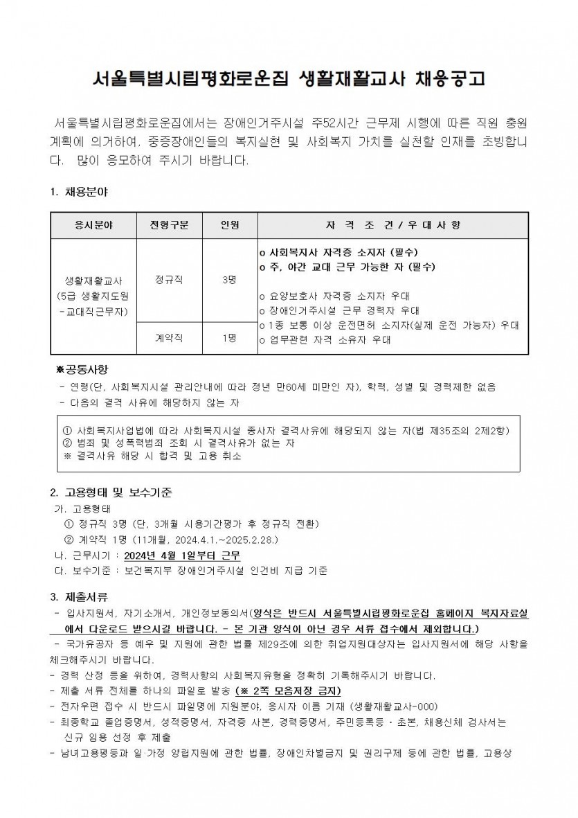 2024년 3차 직원채용(생활지도원) 모집공고 페이지 정보 작성자 한동주 작성일 24-03-07 17:21 조회 19,308회 댓글 0건 첨부파일 파일 시립평화로운집 입사지원서이력서,자기소개서및개인정보동의서.hwp (22.5K) 140회 다운로드 DATE : 2024-03-07 17:21:19 본문 장애인거주시설 주52시간 근무제 시행에 따라 정규직으로 근무할 생활재활교사(생활지도원) 채용 모집 공고를 실시하고자 합니다. 이전글 다음글 목록 답변