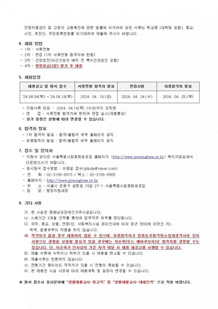 2024년 4차 직원채용(생활지도원) 모집공고 페이지 정보 작성자 한동주 작성일 24-04-04 17:29 조회 19,120회 댓글 0건 첨부파일 파일 시립평화로운집 입사지원서이력서,자기소개서및개인정보동의서.hwp (22.5K) 175회 다운로드 DATE : 2024-04-04 17:29:21 본문 장애인거주시설 주52시간 근무제 시행에 따라 정규직으로 근무할 생활재활교사(생활지도원) 채용 모집 공고를 실시하고자 합니다. 이전글 다음글 목록 답변