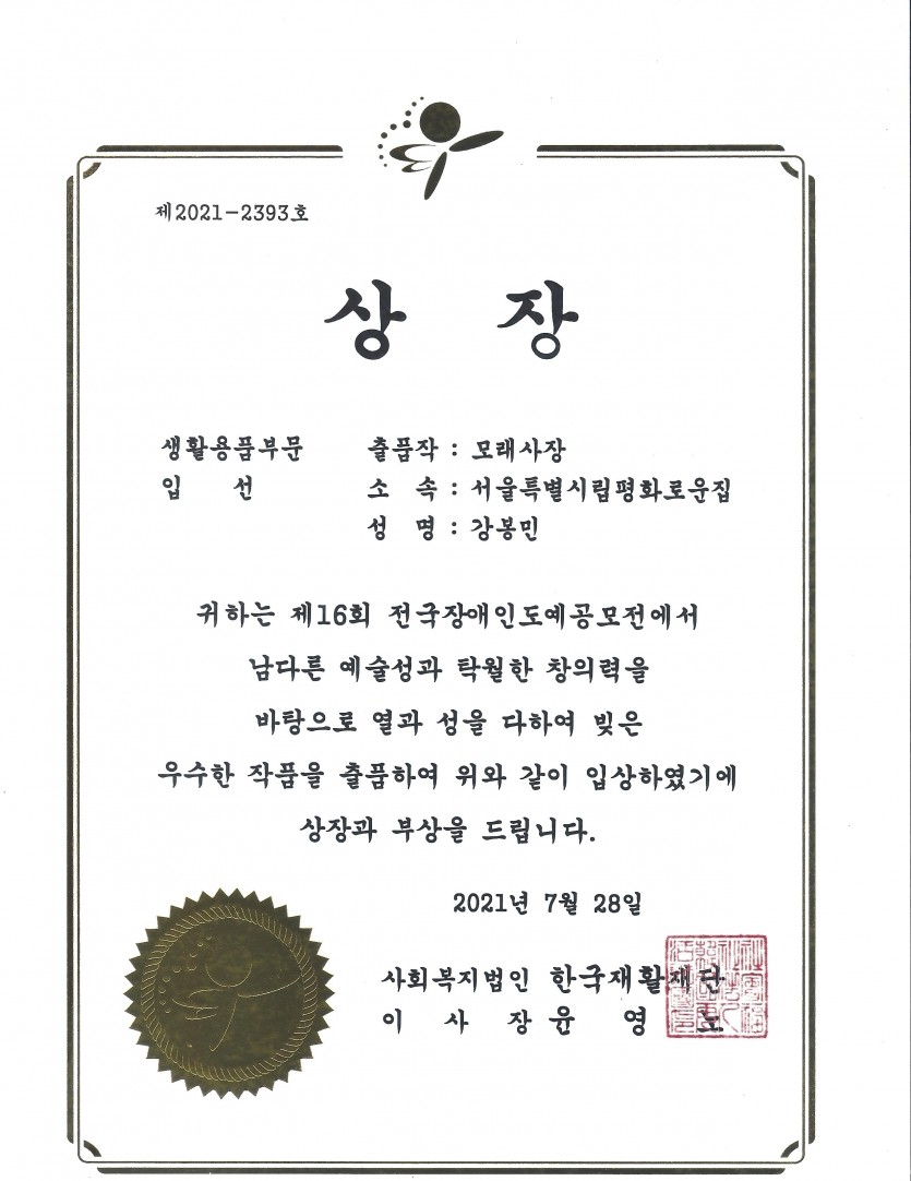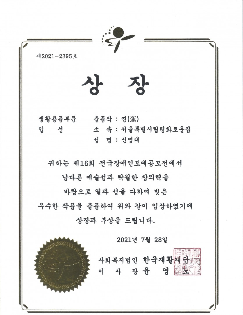 거주인 이야기 | 제16회전국장애인도예공모전, 서울특별시립평화로운집 '입선'