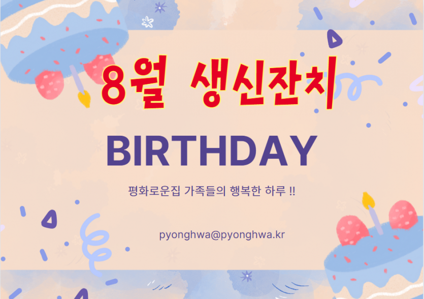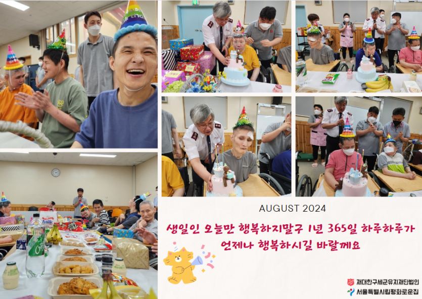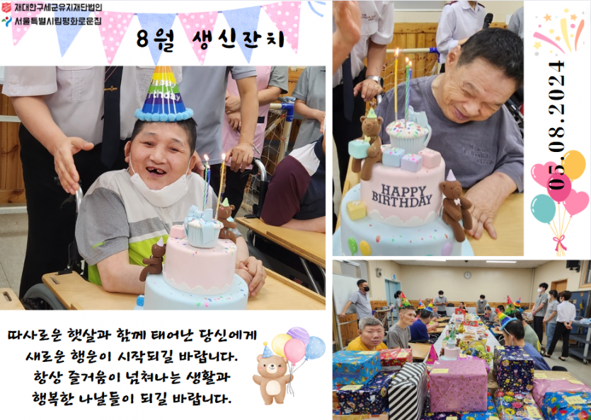 거주인 이야기 | 2024년 8월 생신잔치 페이지 정보 작성자 장설궁 작성일 24-08-07 17:38 조회 7,414회 댓글 0건 본문 평화로운집 생신 가족이 가장 많은 두 달 중 8월 생신잔치를 진행 하였습니다생신을 축하하기 위해 준비한 다양한 음식을 나누며 생신 케이크에 촛불을 밝히고 모두가 함께 생일 노래를 부르며축하하는 시간을 보냈습니다.무더운 날씨 속에서도 건강을 잃지 않도록 유의하시고,시원한 바람과 함께 여유로운 시간 보내세요~ 이전글 다음글 목록