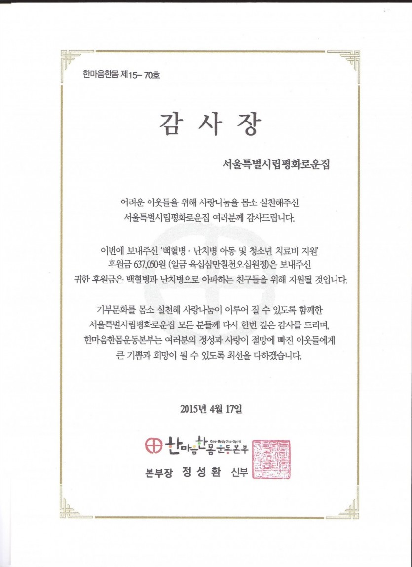 모금액은 637,050원으로 적지않은 금액이 모여 한마음한몸운동본부를 통해 기부하였으며,