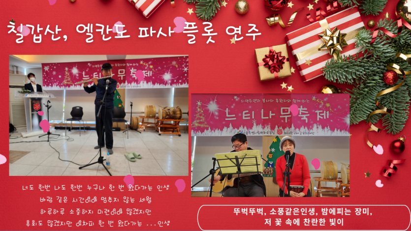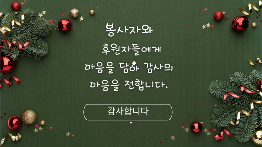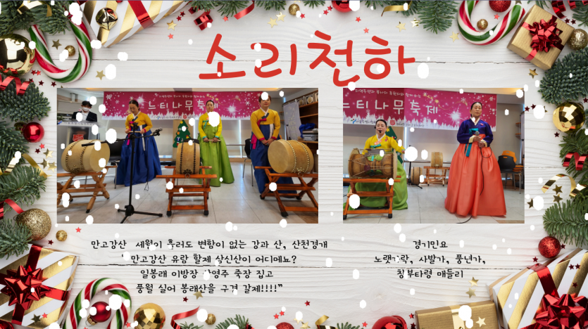 후원자·봉사자 이야기 | 1207 느티나무 축제 페이지 정보 작성자 장설궁 작성일 24-12-12 13:19 조회 6,577회 댓글 0건 본문 "2024년 12월 7일거주인, 자원봉사자, 후원자들과 함께 느티나무 축제를 진행하였습니다. 참석해주신 여러분들에게 감사의 마음을 전합니다. 여러분의 따뜻한 마음과 참여로 인해 행사는 더욱 특별하고 의미 있는 시간이 되었습니다. 여러분의 지지와 도움에 진심으로 감사드립니다. 다시 한 번 참석해주신 여러분들에게 진심으로 감사의 말씀을 전하며, 앞으로도 함께 더 많은 아름다운 순간을 만들어 나가기를 기대합니다. 감사합니다." 이전글 다음글 검색 목록