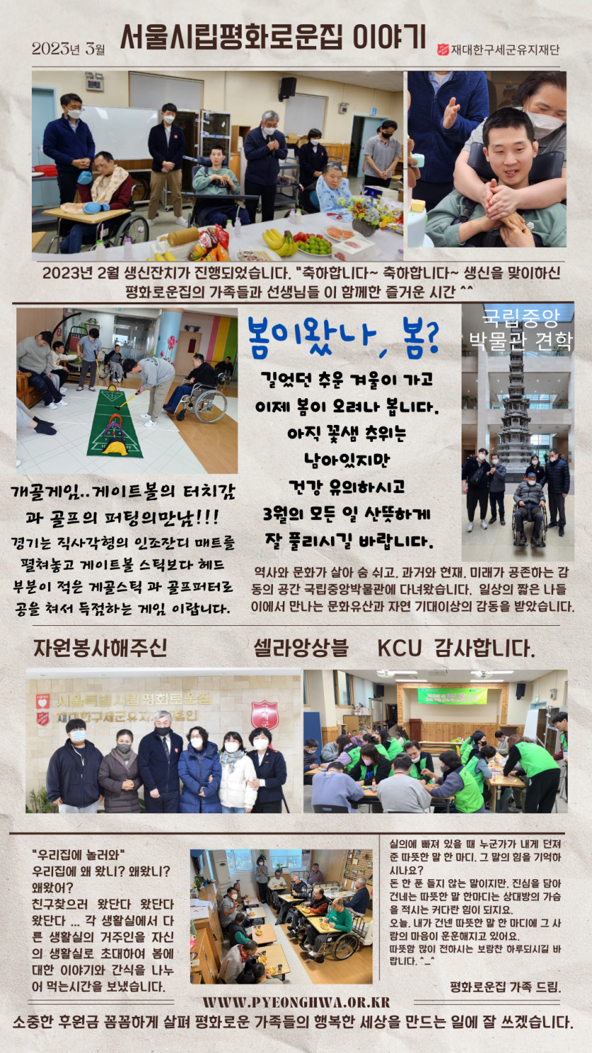 2023년 3월 후원감사편지 페이지 정보 작성자 장설궁 작성일 23-03-01 11:29 조회 10,767회 댓글 0건 본문 3월 첫날이 되었습니다. 봄맞이 준비는 잘 하셨나요? 아직은 아침 저녁으로 쌀쌀한 찬 공기가 있으니 건강에 유의하시기 바랍니다.2023년 3월 봄에는 꼭 봄을 마음껏 즐기시며 보내셨음 합니다. ^^ 이전글 다음글 목록