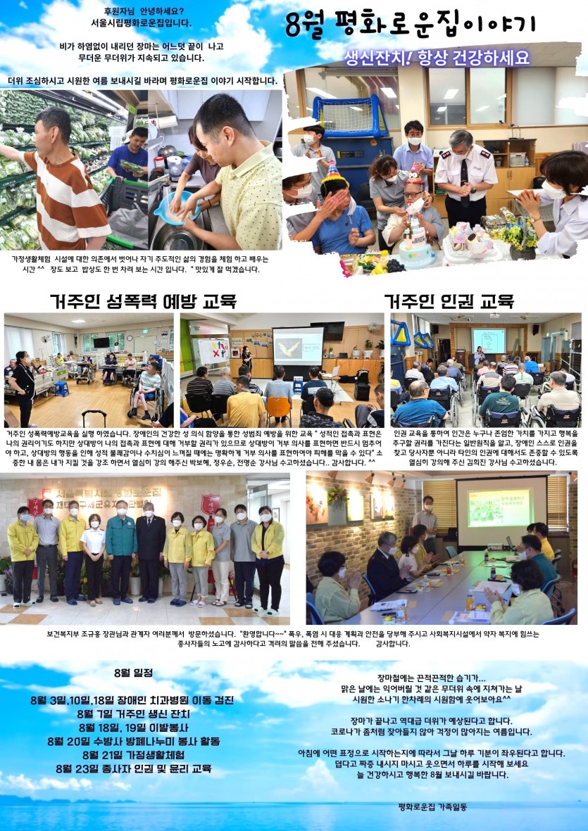 2023년 8월 후원감사편지 페이지 정보 작성자 장설궁 작성일 23-08-05 14:54 조회 8,391회 댓글 0건 본문 무더운 날씨가 연일 계속 이어지고 있지만 충분한 수분 섭취, 가벼운 운동 등으로건강 관리 잘 하셨으면 좋겠습니다. 항상 건강하시고 행복하시길 바라면서 8월 평화로운집 가족 이야기 시작 합니다^^ 이전글 다음글 목록