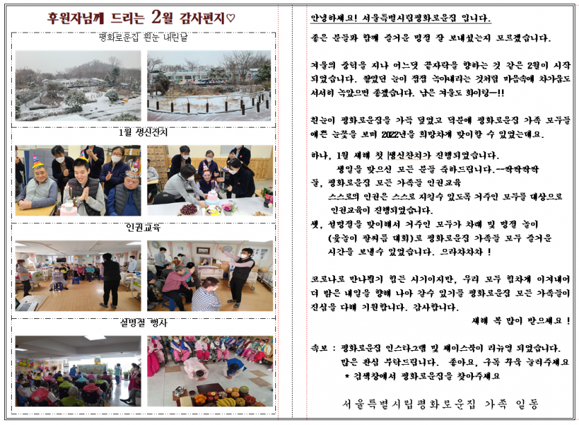 2022년 2월 후원자 감사편지 페이지 정보 작성자 김동현 작성일 22-02-07 14:21 조회 12,953회 댓글 0건 본문 2022년 2월, 겨울이 지나가고 봄이 오고 있습니다.항상 평화로운 집과 함께해주시는 후원자님들께감사의 편지를 올립니다. 이전글 다음글 목록