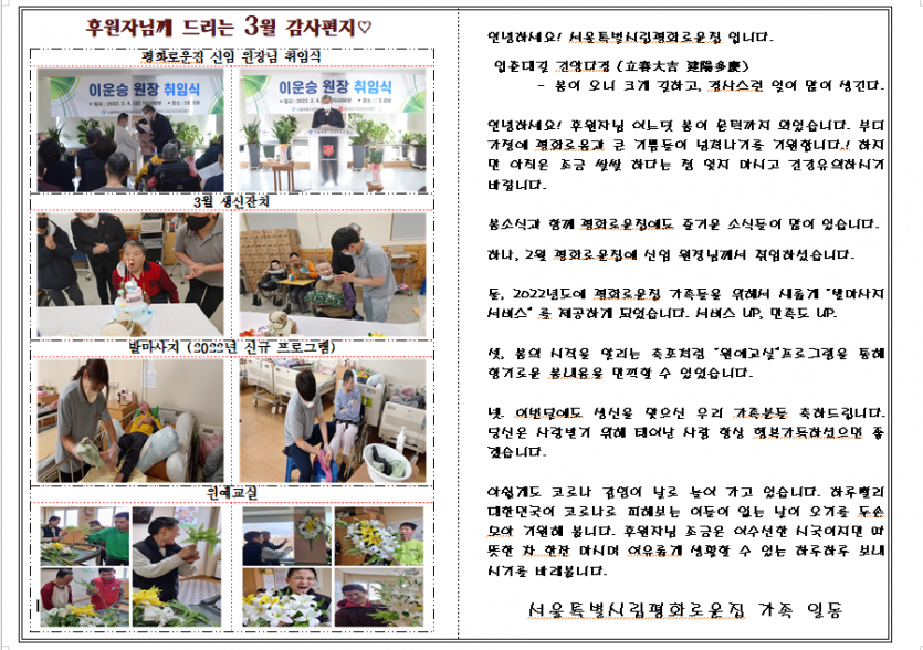 2022년 3월 후원자 감사편지 페이지 정보 작성자 장설궁 작성일 22-07-08 13:10 조회 12,030회 댓글 0건 본문 ♧ 그 어느 해보다 바쁘고 힘겨웠던 겨울을 보낸 뒤 그 어느 해처럼 반갑게만 느껴왔던 봄을 맞이하였습니다. 포근한 햇살에 포근한 봄바람을 실어 평화로운집 식구들의 소식을 전해드립니다~~~ ♧ 이전글 다음글 목록
