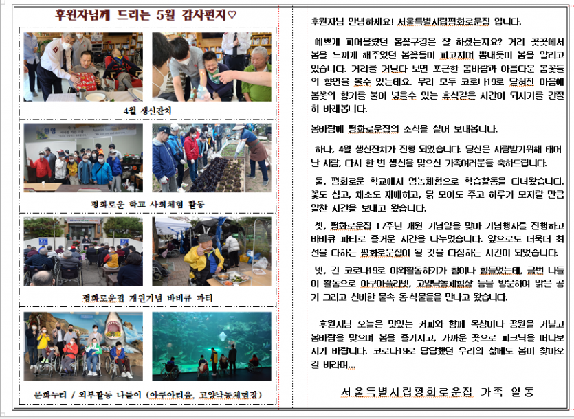 2022년 5월 후원자 감사편지 페이지 정보 작성자 장설궁 작성일 22-07-08 13:31 조회 12,080회 댓글 0건 본문 ♤ 봄향기가 향기로운 5월 이예요~~5월엔 5배로즐겁고 행복한 일들만 가득 하시길 바라며 저희 평화로운집 식구들의 소식을 전합니다.♤ 이전글 다음글 목록