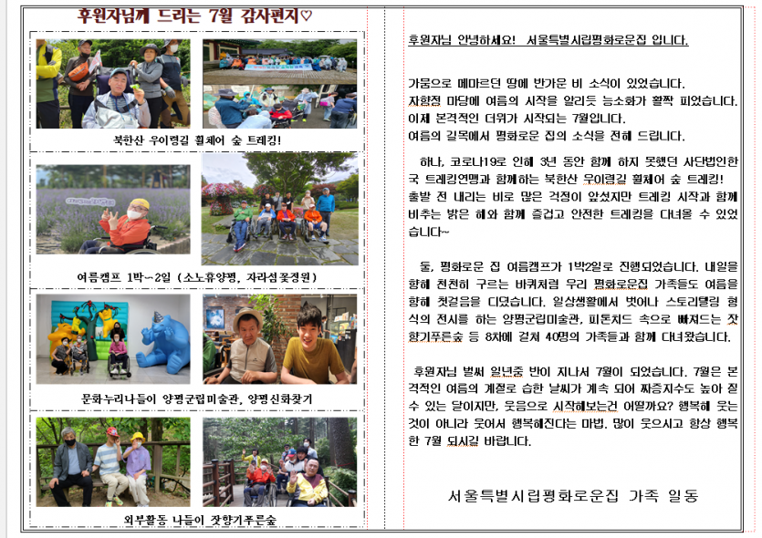 2022년 7월후원자감사편지 페이지 정보 작성자 장설궁 작성일 22-07-14 11:29 조회 12,268회 댓글 0건 본문 ༼ つ ◕_◕ ༽つ들쑥날쑥한 돌멩이가 있기 때문에 시냇물이 아름다운 소리를 내듯이 들쑥날쑥한 일상의 일들이 있을 때 인생도 아름다운 소리를 낸다고 합니다.(●'◡'●)인생이란 계속 좋은일만 있는것도, 계속 나쁜일만 있는 것도 아닙니다.혹시라도.... 지금 힘든일이 있다면.....시간이 조금 지나면 다~~~ 괜찮아 질겁니다.희망을 갖고 힘내세요~ 오늘도 화이팅!! 저희 평화로운집 가족들의 소식을 전해드립니다. 이전글 다음글 목록