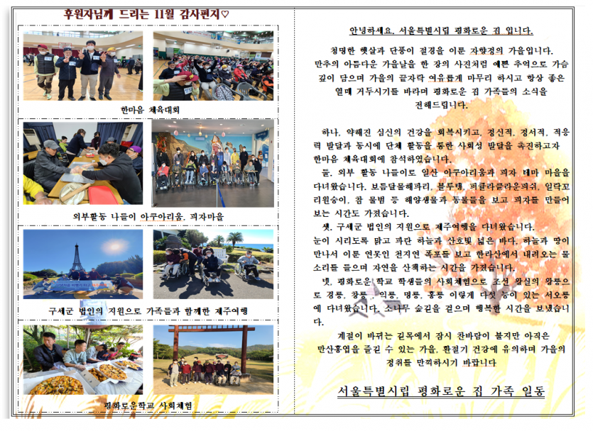2022년 11월 후원감사편지 페이지 정보 작성자 장설궁 작성일 22-11-06 13:22 조회 10,980회 댓글 0건 본문 벌써 11월이네요.가을이 점점 깊어갑니다.화려했던 단풍들도 이제 낙엽이 되어 떨어지기 시작합니다.수북히 쌓인 낙엽길도 걸어보시면서..여유롭게 보내시면 좋겠습니다.11월도 건강하시고,하시는 모든일에 행운과 행복이 가득하시길 바랍니다.아자!아자! 화이팅! 이전글 다음글 목록