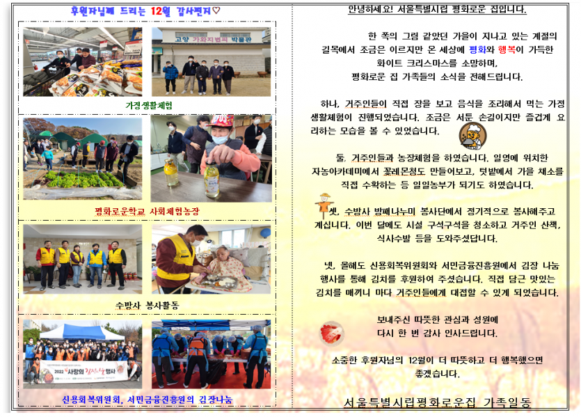 2022년 12월 후원감사편지 페이지 정보 작성자 장설궁 작성일 22-12-08 13:00 조회 10,886회 댓글 0건 본문 어느덧 2022년 한해를 마무리하는 마지막 달 12월이 되었습니다. 우리가 함께 해서 너무나 행복한 시간들 이었습니다.남은 시간을 아쉬워 하기보다는 채워가는 12월 보내시길 바랍니다. 소리 없이 세상을 하얗게 물들이는 하얀 눈처럼 조용히 찾아오는 일상에서 평온함이 가득하길 기원합니다. ♡ 이전글 다음글 목록