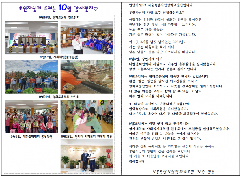 2021년 10월 후원자 감사편지 페이지 정보 작성자 박상은 작성일 21-11-18 10:04 조회 12,643회 댓글 0건 본문 청량한 하늘이 아름다운 10월,후원자님께 감사의 편지를 올립니다. 이전글 다음글 목록