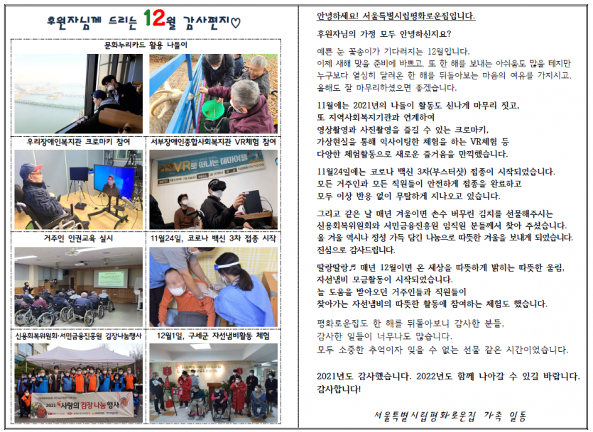 2021년 12월 후원자 감사편지 페이지 정보 작성자 박상은 작성일 22-01-05 17:31 조회 12,521회 댓글 0건 본문 크리스마스캐롤 울려퍼지는 아름다운 겨울입니다.12월, 후원자님께 감사의 편지를 올립니다. 이전글 다음글 목록