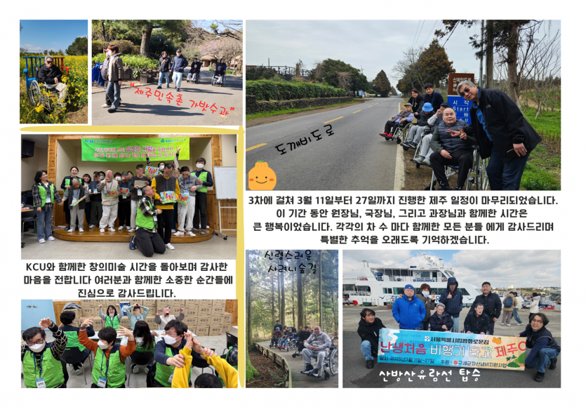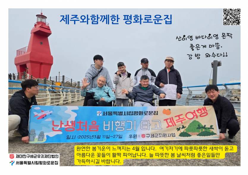 2025년 시립평화로운집 4월 후원 감사 편지 페이지 정보 작성자 장설궁 작성일 25-04-01 11:43 조회 4,436회 댓글 0건 본문 따뜻한 봄의 기운이 가득한 4월, 여러분의 사랑과 후원에 진심으로 감사드립니다.3월에 제주도에서 새로운 경험을 하였습니다. 다양한 문화와 아름다운 자연환경을 경험하며 새로운 영감을 얻는 시간이었습니다. 여러분의 관심과 사랑으로, 우리는 더 큰 꿈을 향해 나아갈 수 있습니다. 여러분의 지속적인 사랑과 후원에 감사드리며, 우리가 함께하는 이 여정에서 더 큰 성과를 이루기를 기대합니다.진심으로 감사드립니다. 이전글 다음글 목록