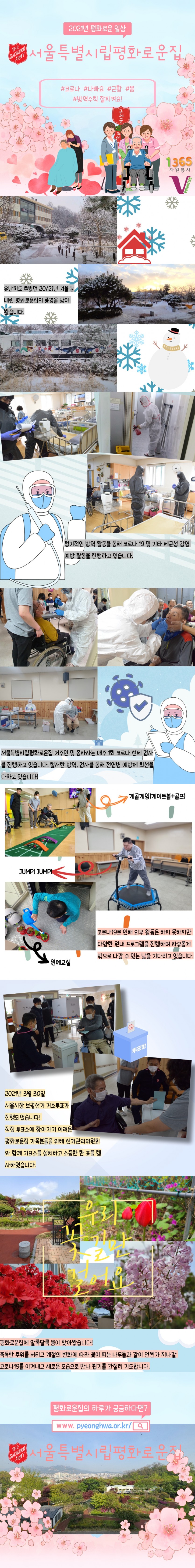 서울특별시립평화로운집 4월 카드 뉴스! 페이지 정보 작성자 박성호 작성일 21-04-23 17:26 조회 17,040회 댓글 0건 본문 코로나19로 인해 오랜 기간 시립평화로운집을 방문하지 못한 봉사자님을 위해 최근 근황을 카드뉴스를 통해 전해 드리고자 합니다.앞으로 지속적으로 업로드될 예정이니 많은 관심 부탁드립니다~~ ^3^ 이전글 다음글 목록